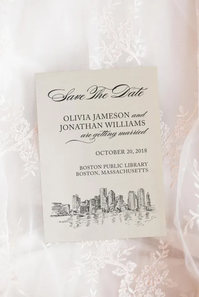 If you want your invitations to have a more classic feel, consider adding some Boston flair to your save-the-date cards. Take a look at these examples of Boston-inspired save-the-date cards and invitations.